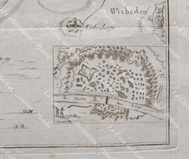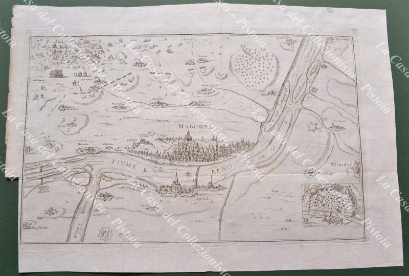 MAGONZA, Germania. Veduta a volo d'uccello della città e suoi dintorni. Grande incisione all'acquaforte di mm 355x225 (ai margini mm 400x285) stampata nel 1794 a Cesena da Biasini e tratta dall'opera Almanacco Istorico, Politico, Militare, Scientifico.... Buona conservazione. (Rif.F2486)