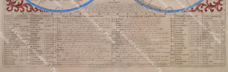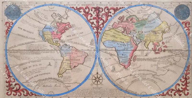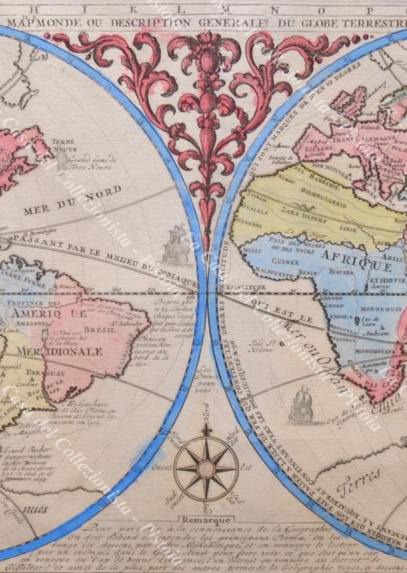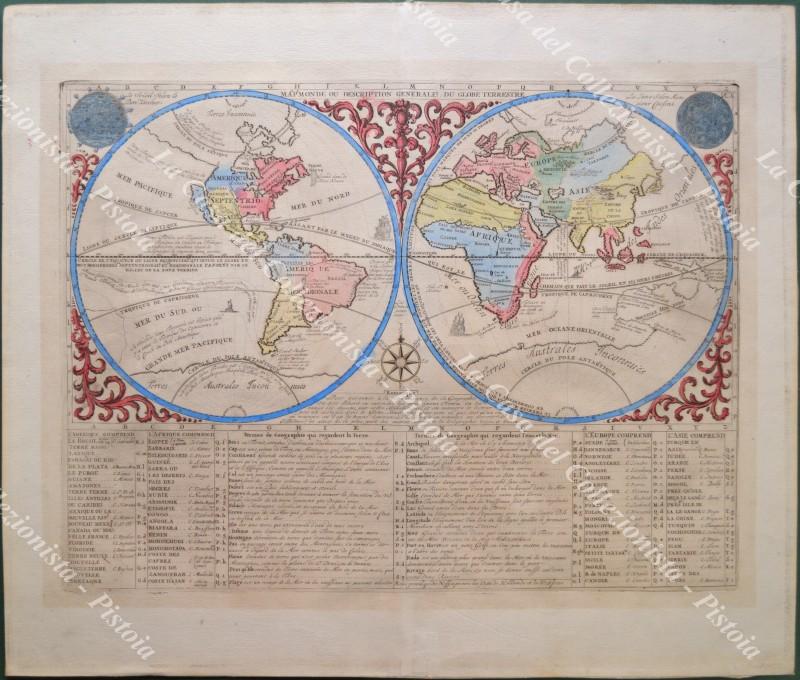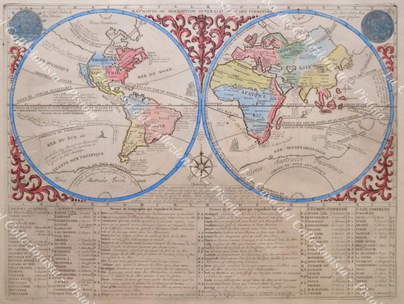 MAPPAMONDO. MAPP. MONDE OU DESCRIPTION GENERALE DU GLOBE TERRESTRE. Bella carta colorata all’epoca tratta da Atlas Historique di H.A. Chatelain, Amsterdam 1719. Alla base un elenco di nomi di terre di Asia, Africa, Europa e America e dei termini geografici relativi al mare. Conservazione ottima eccetto minime imperfezioni (strappetto di circa 2 cm sul margine inferiore e piccolo alone di adesivo al retro lungo i bordi per precedente montaggio). (Rif.F3002-287/75)