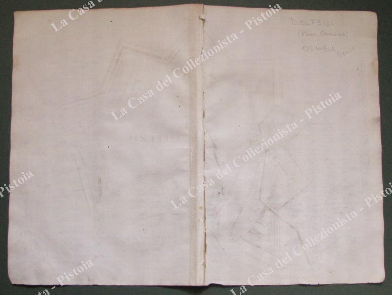 OLANDA. Pianta topografica della città di "DELFIZIL". Incisione realizzata con la tecnica dell'acquaforte tratta da "Teatro del Belgio o sia descritione delle diecisette provincie del medesimo; Con le Piante delle Città, e Fortezze Principali; da chi al presente possesse; come, in qual modo, & in qual tempo acquistate. Aggiontovi un Succinto racconto di quanto è occorso dalla mossa d'armi del Re Christianissimo contro gli Stati Generali delle Provincie Unite fin' al fine del 1672. Descritta dal Conte Galeazzo Gualdo Priorato", opera stampata in Francoforte nel 1683. Misura cm 41,2x31,8 (ai margini cm 45,3x33,6). E' presente uno strappo ricomposto lungo la piegatura editoriale della carta. (Rif.D7058)