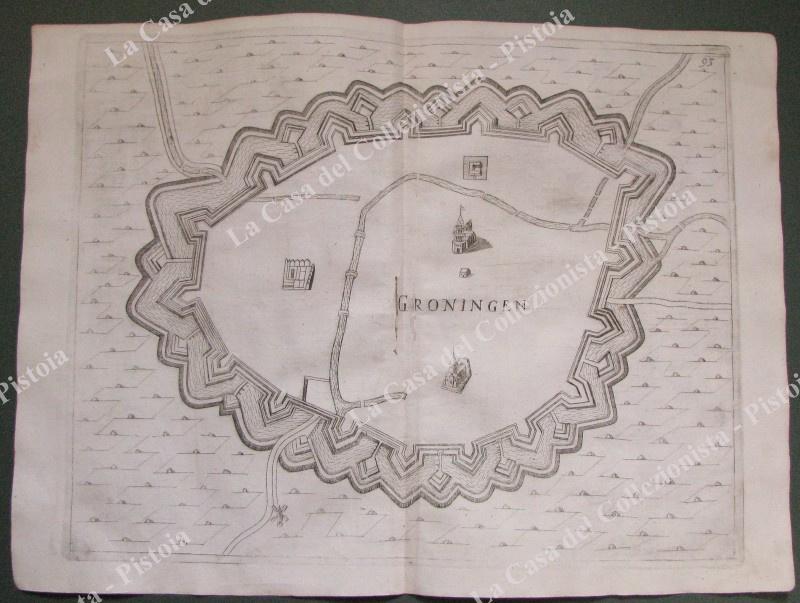 OLANDA. Pianta topografica della città di "GRONINGEN". Incisione realizzata con la tecnica dell'acquaforte tratta da "Teatro del Belgio o sia descritione delle diecisette provincie del medesimo; Con le Piante delle Città, e Fortezze Principali; da chi al presente possesse; come, in qual modo, & in qual tempo acquistate. Aggiontovi un Succinto racconto di quanto è occorso dalla mossa d'armi del Re Christianissimo contro gli Stati Generali delle Provincie Unite fin' al fine del 1672. Descritta dal Conte Galeazzo Gualdo Priorato", opera stampata in Francoforte nel 1683. Misura cm 38,8x30,6 (ai margini cm 45,1x33,6). Sono presenti 2 strappi ricomposti di lungo la piegatura editoriale della carta. (Rif.D7057)