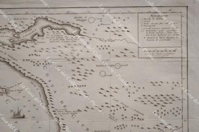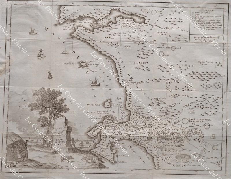SUD AFRICA. Carta geografica origianale. "CARTA GEOGRAFICA DEL CAPO DI BUONA SPERANZA". Venezia, Salmon circa 1750. Mm 425x330 (ai margini 495x370). Più volte ripiegata (proviene d alibro), qualche strappetto marginale di cui uno interessa la cornice. (Rif.D9355)