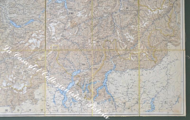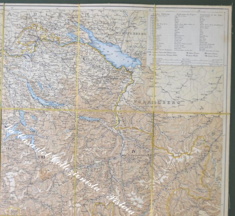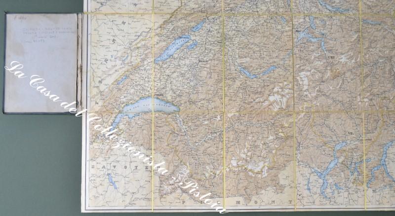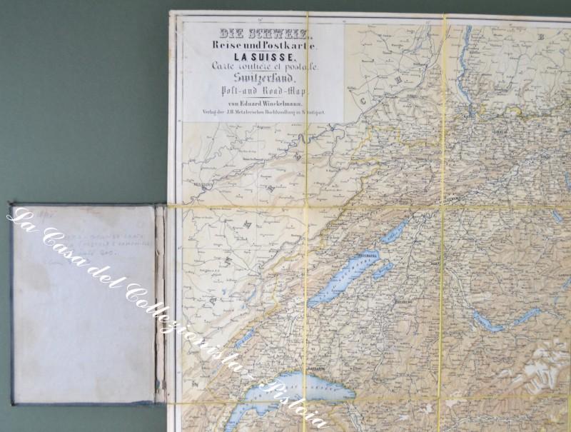 SVIZZERA. "Die Scweiz reise – und post karte von Eduard Winkelmann”. Stoccarda, senza data (circa 1850). Grande carta telata di cm 52x73, più volte ripiegata, racchiusa in bella copertina con decori a secco e titoli in oro. Assai dettagliata, indicazioni postali e di comunicazione. Legende in tedesco, francese e inglese, con percorsi stradali, ferroviari e postali, ecc.. Lievi macchie alla copertina, ma buone condizioni. (Rif.D1776 - 258/65)