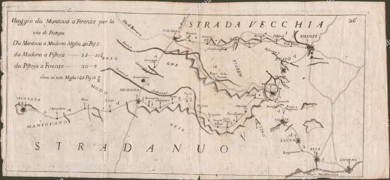 EMILIA - TOSCANA. Itinerario postale. "Viaggio da Mantova a Firenze per la via di Pistoia". Rara carta tratta dalla guida di Carlo Barbieri edita nel 1790. Mm 350x160 (ai margini 380x175). Ottima conservazione eccetto due minime fessurazioni laterali in corrispondenza della piegatura. (Rif.B2873-237/70)