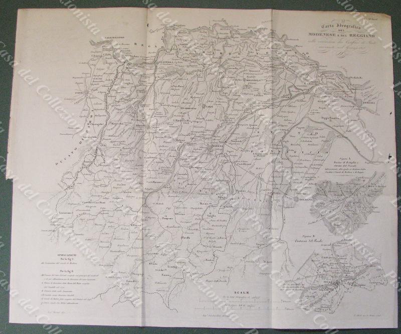EMILIA. “CARTA IDROGRAFICA DEL MODENESE E DEL REGGIANO colle variazioni dei Confini di Stato avvenute nel Gennaio 1848”. Opera dell’Ing. Elia Lambardini, dis. da Marini e incisa da Allodi nel 1848. Mm 485x410, ripiegata più volte, minime mancanze laterali di carta. Non comune. (Rif.D9942-549/73)