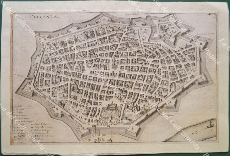 EMILIA. PIACENZA. La città a volo d’uccello, 18 richiami a lato. Tratta dall’opera di Matteo Merian, anno 1640