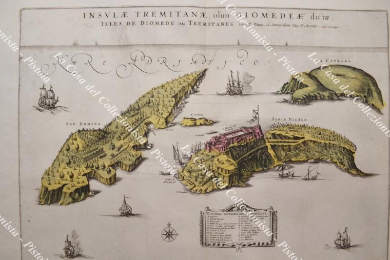 (Puglia - Foggia - Gargano) ISOLE TREMITI. "INSULAE TREMITANAE olim DIOMEDEAE dictas. ISLES DE DIOMEDE OU TREMITANES. Par Mr. Blaeu. A. Amsterdam Chez P. Mortier". Grande carta in coloritura coeva; mm 492x382 (ai margini mm 603x516). Amsterdam, circa 1705. Ottima conservazione. (Rif.F7483)