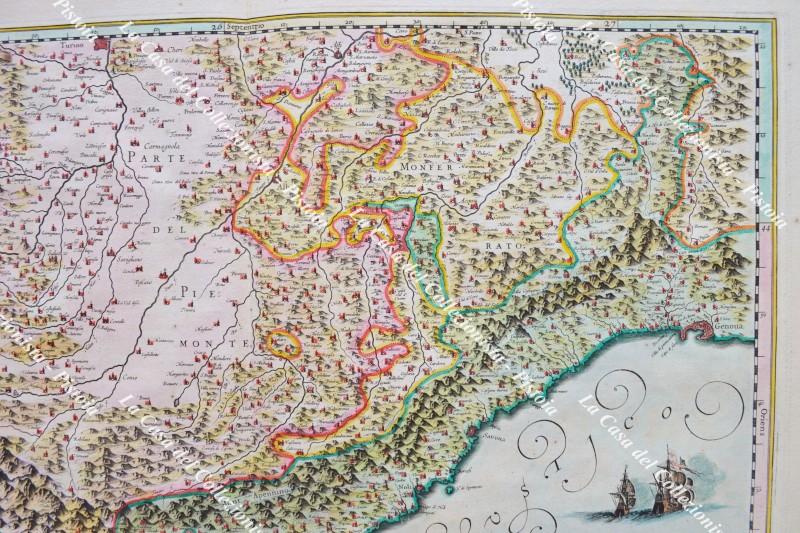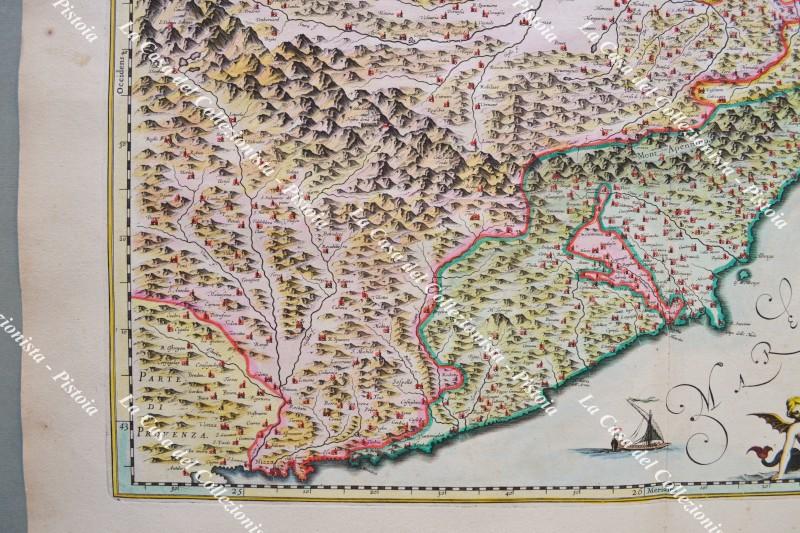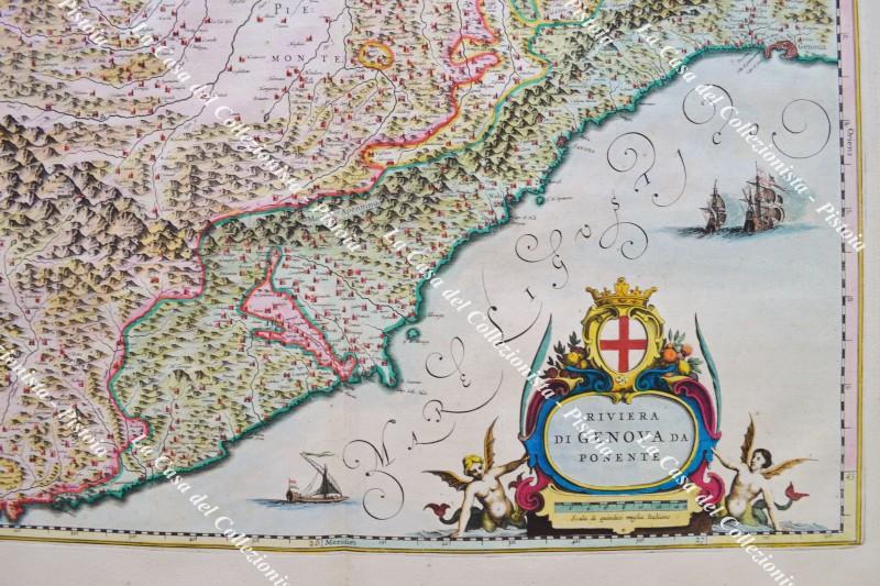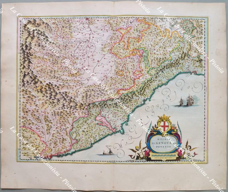 LIGURIA. “RIVIERA DI GENOVA”. Carta doppia di mm 495x380 (ai margini mm 580x485). Grande cartiglio e navi in mare. Mostra la costa da Nizza a Genova e parte del Piemonte. Carta geografica a doppia pagina tratta dall’ATLAS MAIOR di Willem Joan Blaeu edito in Amsterdam tra il 1662 e il 1665, testo in latino a retro. Splendida coloritura non coeva. Buona conservazione, minime bruniture laterali. (Rif.F5720-76)