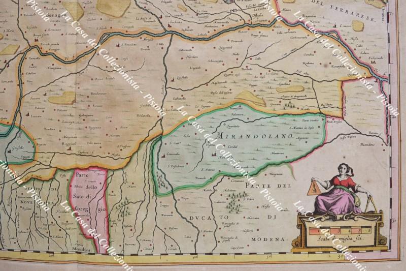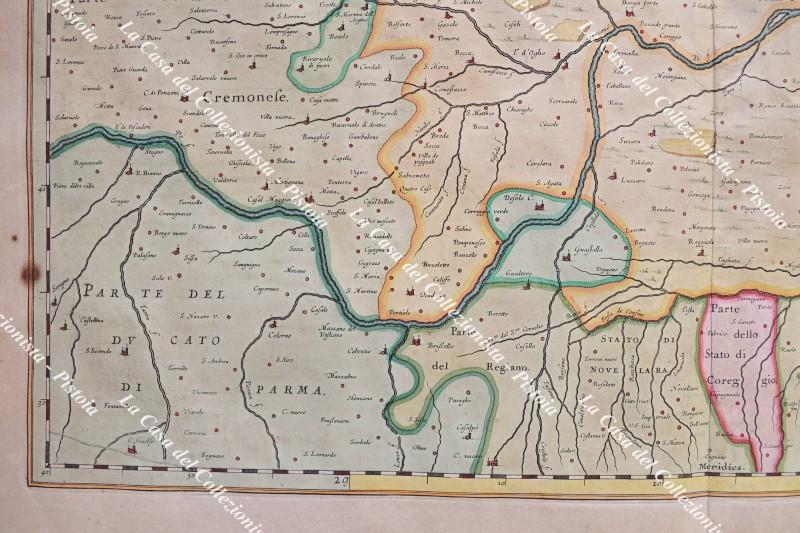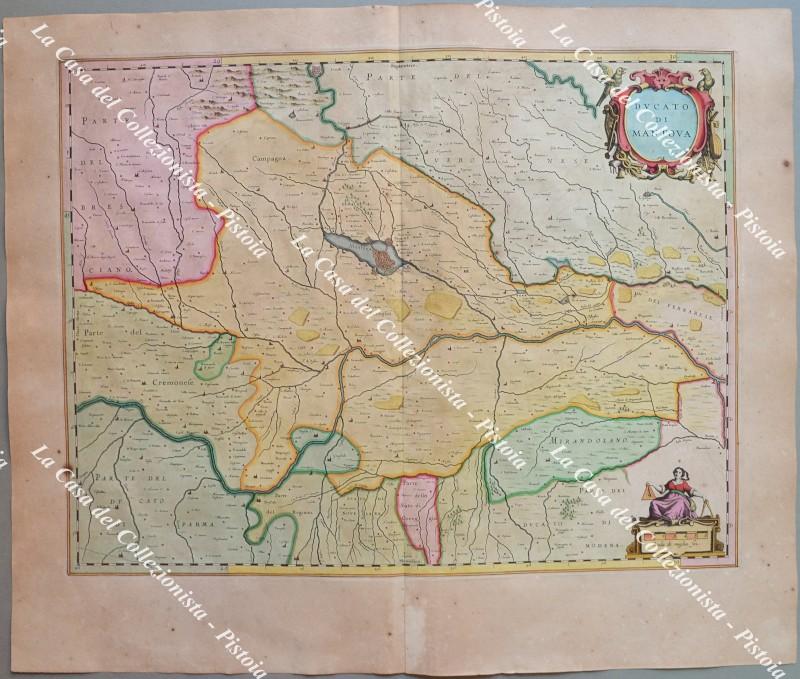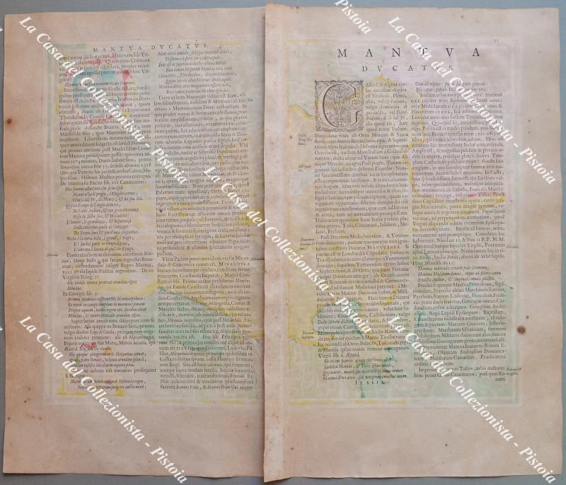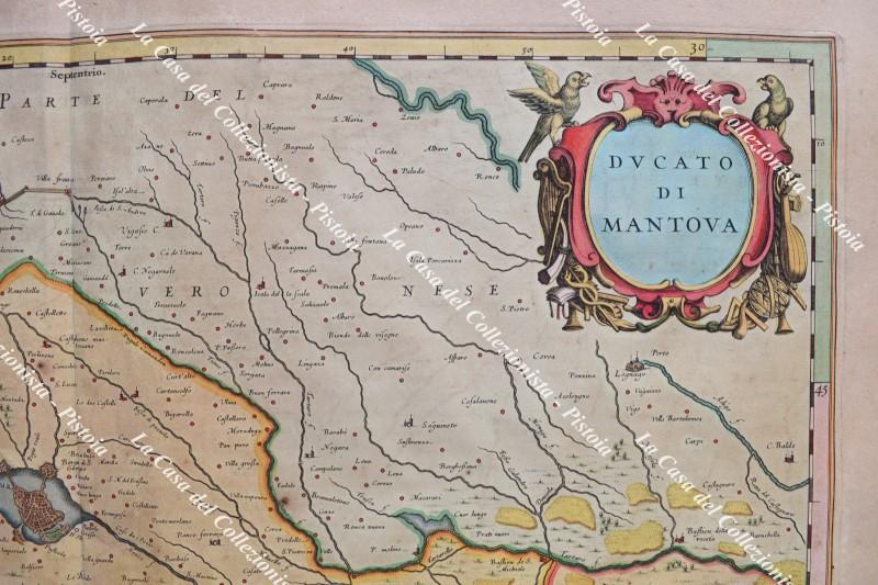 LOMBARDIA. “DUCATO DI MANTOVA”. Carta doppia di mm 495x380 (ai margini mm 580x485). Due cartigli. Carta geografica a doppia pagina tratta dall’ATLAS MAIOR di Willem Joan Blaeu edito in Amsterdam tra il 1662 e il 1665, testo in latino a retro. Comprende pure marginalmente parte dei territori bresciano, cremonese, parmense, reggiano, modenese, ferrarese, veronese. Splendida coloritura non coeva. Conservazione buona, marginali piccole bruniture. (Rif.F5708-76)