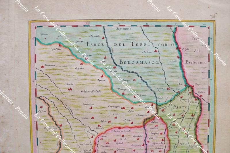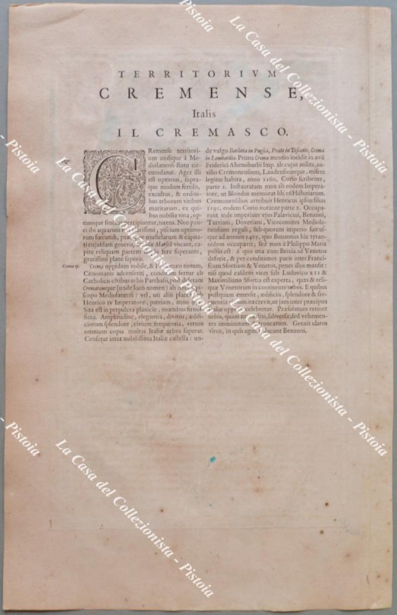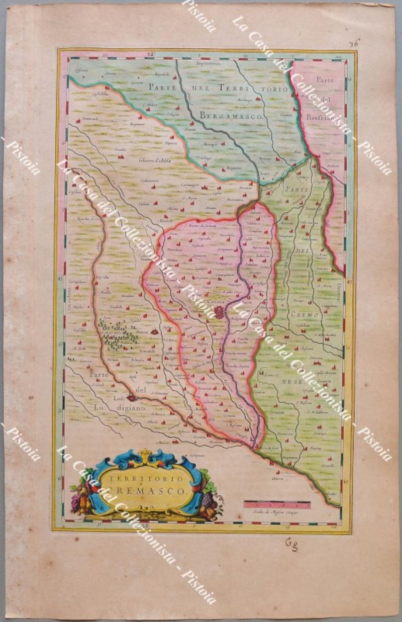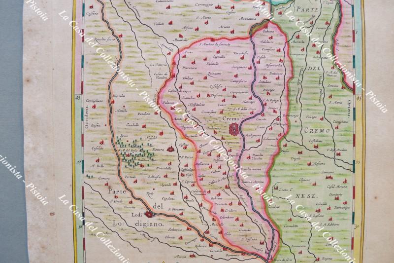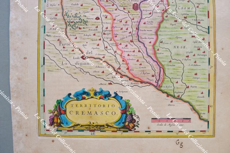LOMBARDIA. “TERRITORIO CREMASCO”. Carta doppia di mm 235x380 (ai margini mm 310x485). Cartiglio e scala metrica. Carta geografica a doppia pagina tratta dall’ATLAS MAIOR di Willem Joan Blaeu edito in Amsterdam tra il 1662 e il 1665, testo in latino a retro. Comprende pure parte del territorio bergamasco, lodigiano e cremonese. Splendida coloritura non coeva. Pochi puntini d’ossidazione. (Rif.F5714-76)