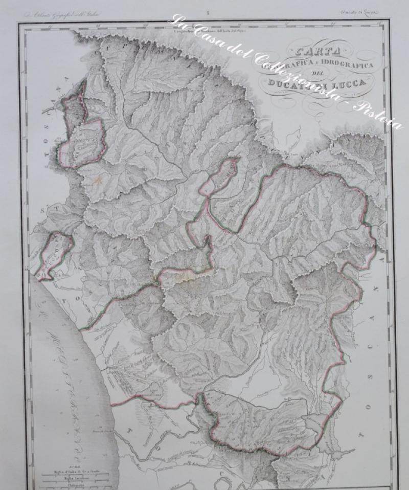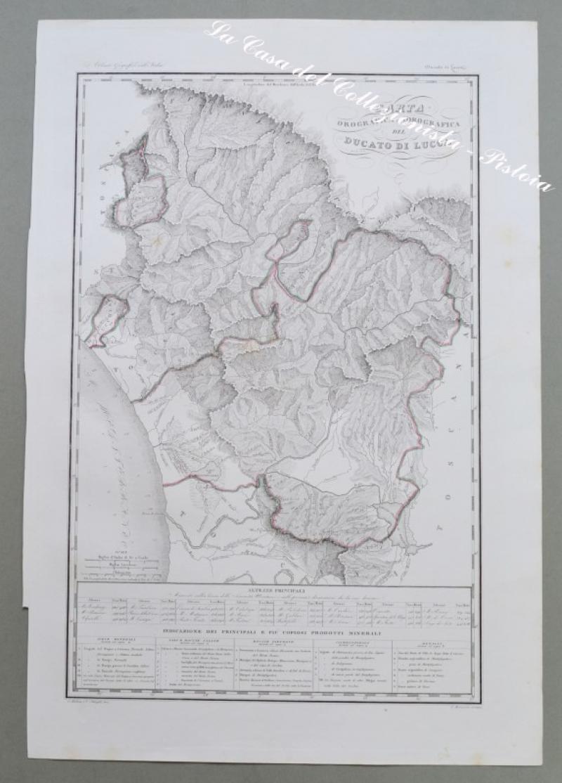LUCCA, Toscana, 1845. "CARTA OROGRAFICA E IDROGRAFICA DEL DUCATO DI LUCCA". Bella carta con i confini colorati di mm 425 x 615 ai marigini, incisa