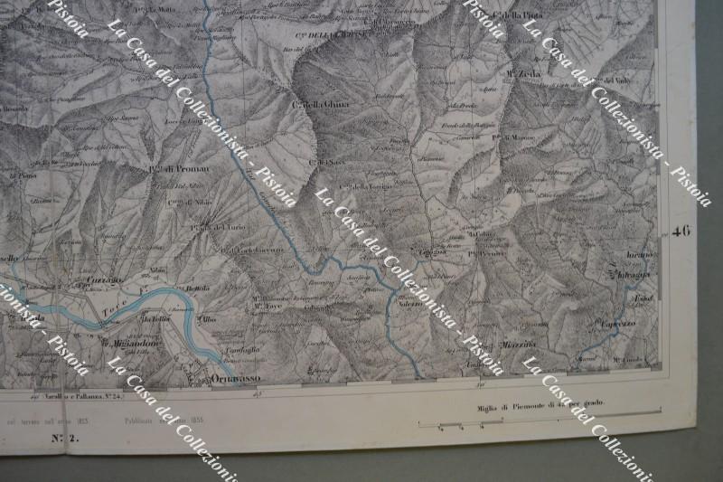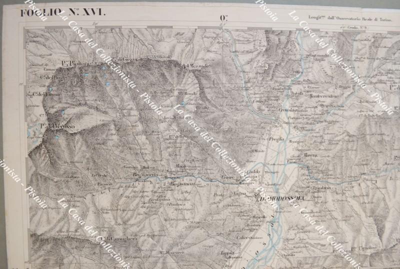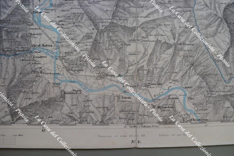 PIEMONTE. DOMODOSSOLA, foglio XXVI. Anno 1856. Carta geografica alla scala di 1:50.000 realizzata dal Corpo di Stato Maggiore ed edita a Torino da Giovanni Maggi. Ripiegata e montata all’epoca su tela, fiumi e laghi colorati in azzurro e misura ai margini cm 74x55. Contenuta, ripiegata in 4, in cartella coeva in cartoncino marmorizzato col nome della carta. (Rif.F6354)
