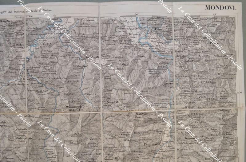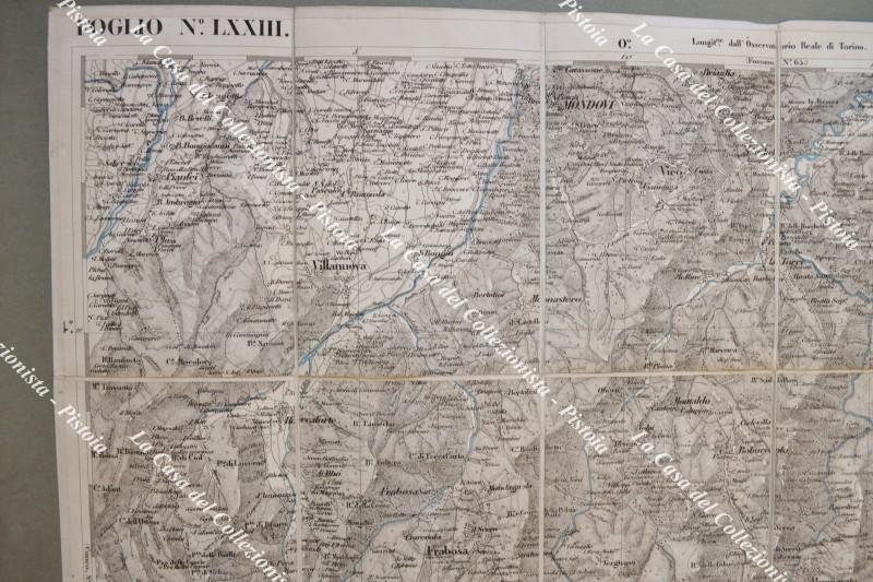 PIEMONTE. MONDOVI’, foglio n. LXXIII. Circa anno 1855. Carta geografica alla scala di 1:50.000 realizzata dal Corpo di Stato Maggiore ed edita a Torino da Giovanni Maggi. Ripiegata e montata all’epoca su tela, fiumi e laghi colorati in azzurro e misura ai margini cm 74x55. Ripiegata in quattro. (Rif.F6358)