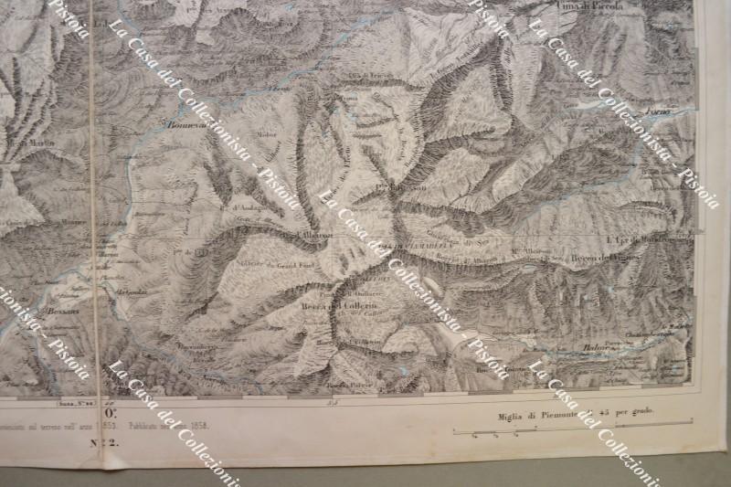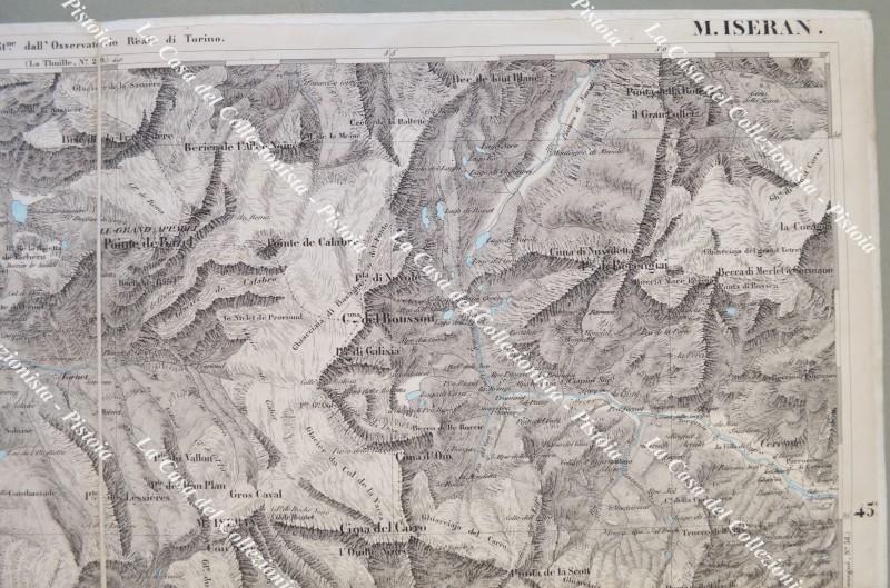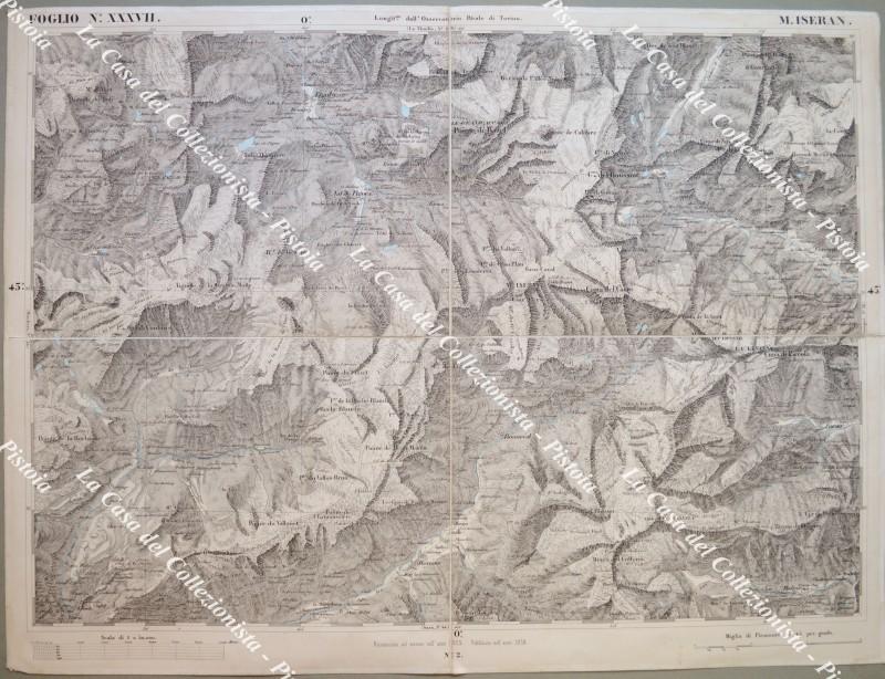 PIEMONTE. MONTE ISERAN, foglio n. XXVII. Anno 1858. Carta geografica alla scala di 1:50.000 realizzata dal Corpo di Stato Maggiore ed edita a Torino da Giovanni Maggi. Ripiegata e montata all’epoca su tela, fiumi e laghi colorati in azzurro e misura ai margini cm 74x55. ripiegata in quattro. (Rif.F6357)