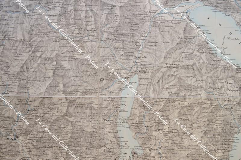 PIEMONTE. VARALLO e PALLANZA, foglio numero XXIV. Anno 1855. Carta geografica alla scala di 1:50.000 realizzata dal Corpo di Stato Maggiore ed edita a Torino da Giovanni Maggi. Ripiegata e montata all’epoca su tela, fiumi e laghi colorati in azzurro e misura ai margini cm 74x55. Contenuta, ripiegata in 4, in cartella coeva in cartoncino marmorizzato col nome della carta. (Rif.F6355)