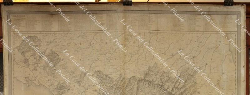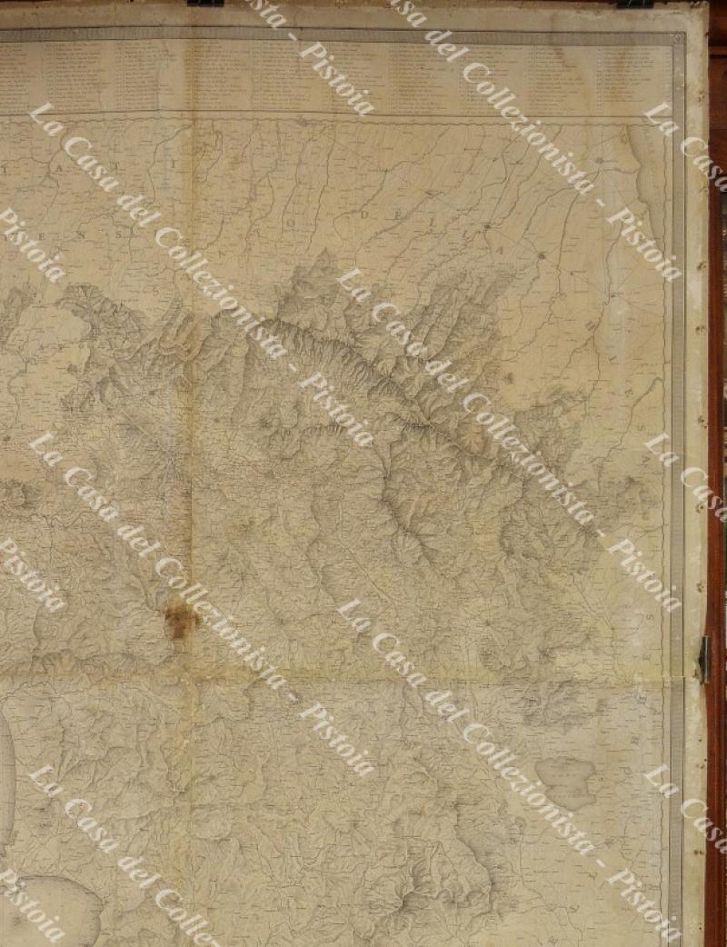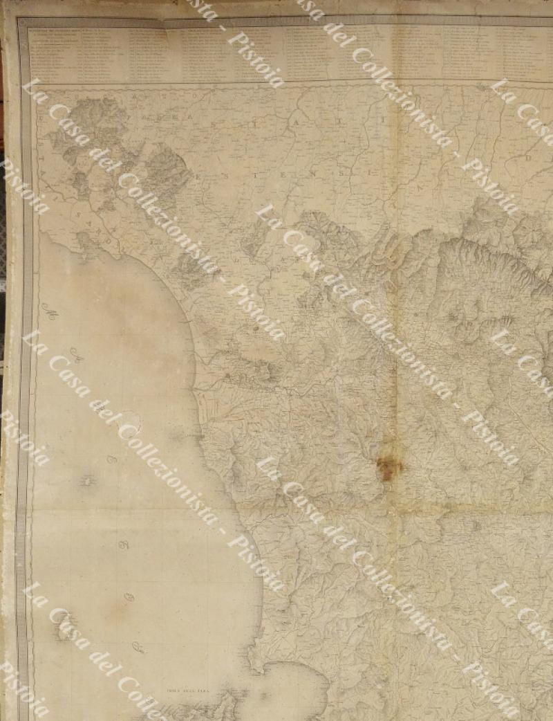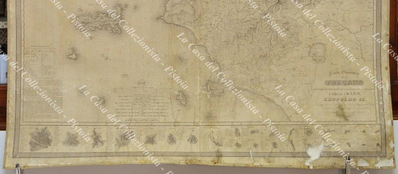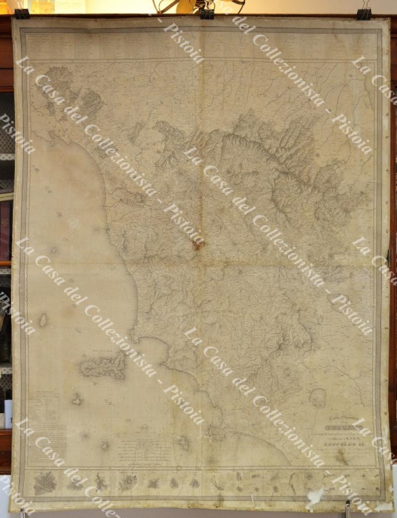 TOSCANA - CARTA MURALE. INGHIRAMI GIOVANNI. CARTA GEOMETRICA DELLA TOSCANA RICAVATA DAL VERO NELLA PROPORZIONE DI 1:200.00 E DEDICATA A S.A.I. E R. LEOPOLDO II.... dal suo ossequiosissimo servo e suddito Giovanni Inghirami delle Scuole Pie. Stucchi diresse l’incisione. Firenze, 1830. Grande carta geografica in 4 fogli incisi in rame montata su tela. Misura ai margini mm 1570x1530. In alto l’elenco delle principali quote, in basso piantine di città toscane. Carta rara e di estrema importanza nella storia della cartografia toscana; il progetto di Giovanni Inghirami vide, prima in Europa, la realizzazione coordinata tra cartografia a fini catastali e cartografica a fini amministrativi e scientifici. Esemplare con interventi di restauro: lungo i margini segni di antica affissione (macchie di ruggine da puntine), in basso alcuni reintegri di carta e qualche abrasione, una macchia bruna centrale e piccoli difetti. Nel complesso esemplare accettabile. (Rif.F1113-230/74)