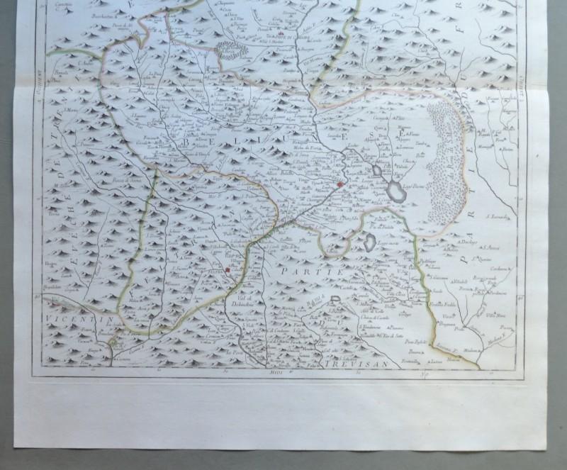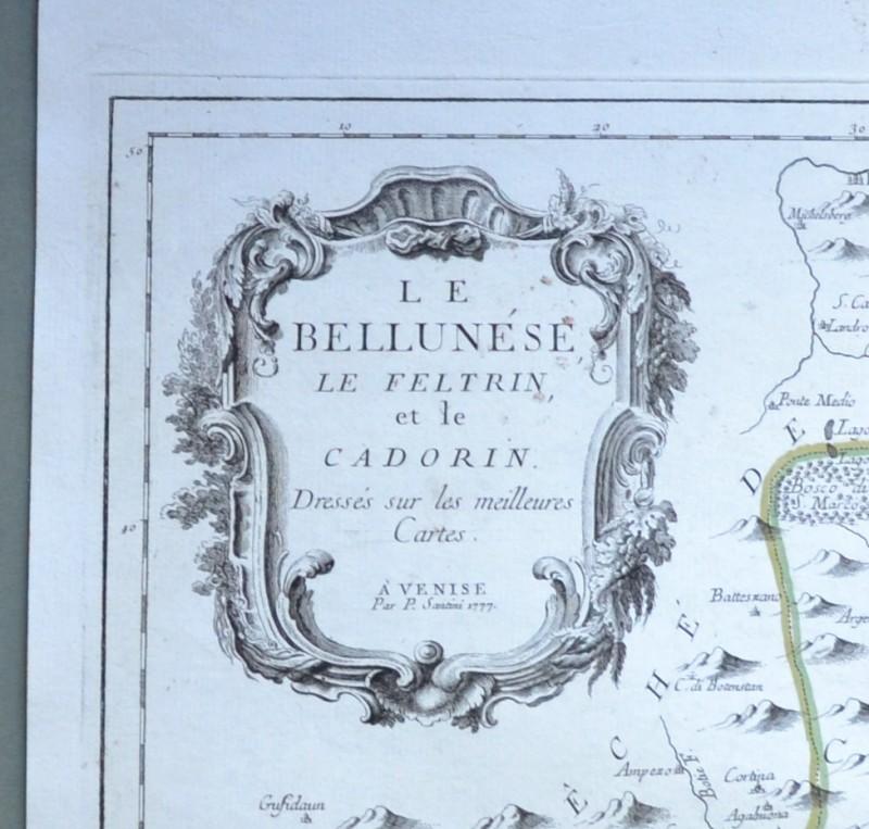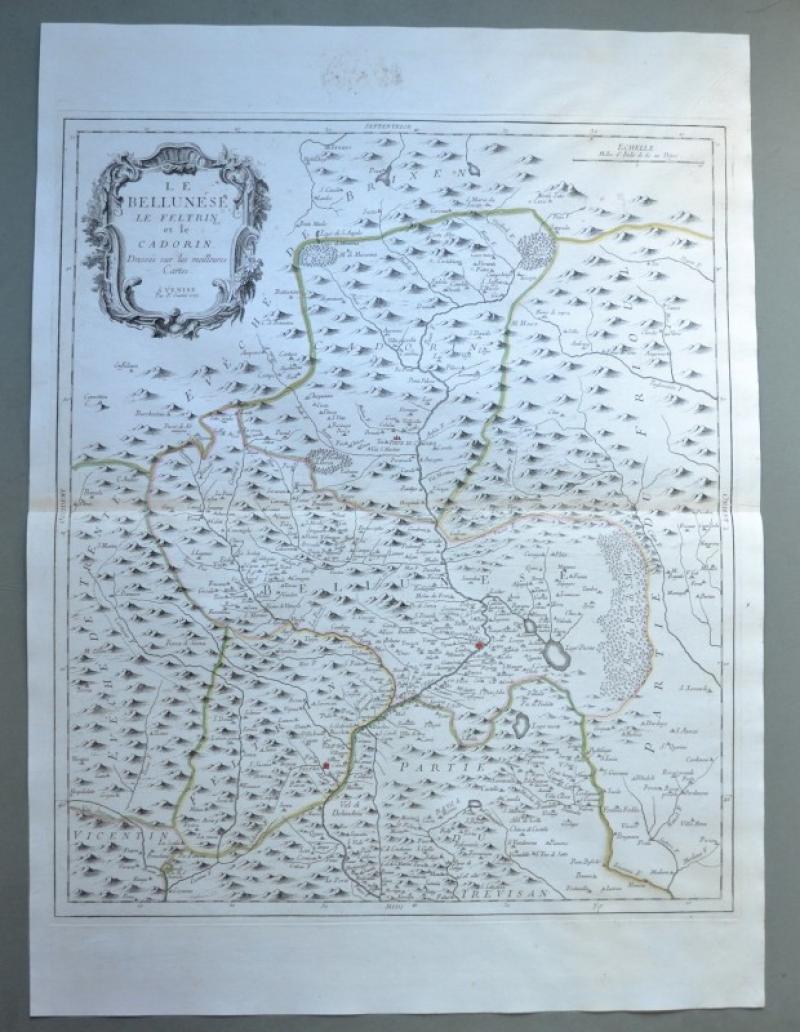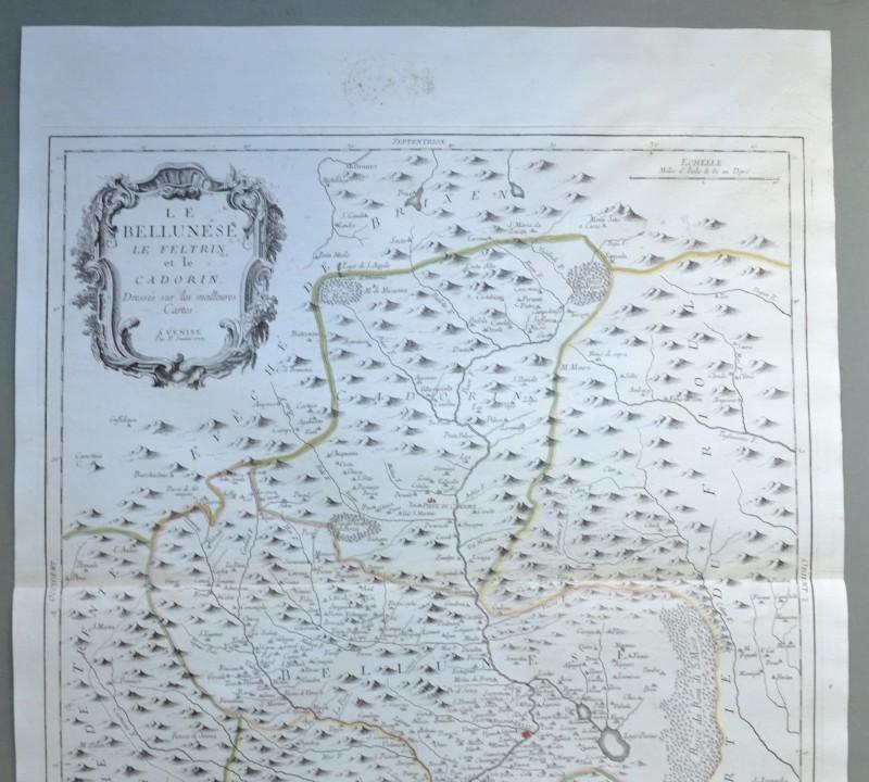 VENETO – BELLUNO. "LE BELLUNESE, LE FELTRIN et le CADORIN”. Bella grande carta doppia con cartiglio inciso e confini colorati. Mostra l’intero Bellunese e parti del Trentino, Trevigiano e Friulano. Tratta da ATLAS UNIVERSEL di Francesco Santini, stampato nel 1784 da Remondini a Venezia. Misura mm 477x565 (ai margini 515x700). Ottima conservazione. (Rif.D3140 - 125/66)