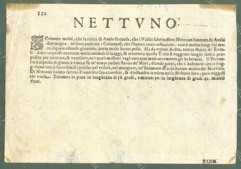LAZIO – NETTUNO. NETUNO. Veduta generale a volo d’uccello. Trattata dall’opera di Francesco Bertelli Theatro delle Città D’Italia, edita a Padova nel 1629. Incisione su rame di mm 182x118 più margini. Qualche piccolo difetto sui margini bianchi (due strappetti e due aloni di adesivo). (Rif.D9704-256/73)