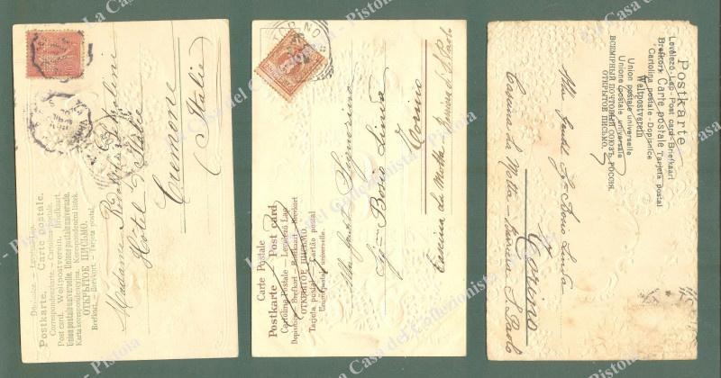 3 CARTOLINE A RILIEVO. Viaggiate inizio '900. Un francobollo caduto e minime imperfezioni. (Rif.E1483)
