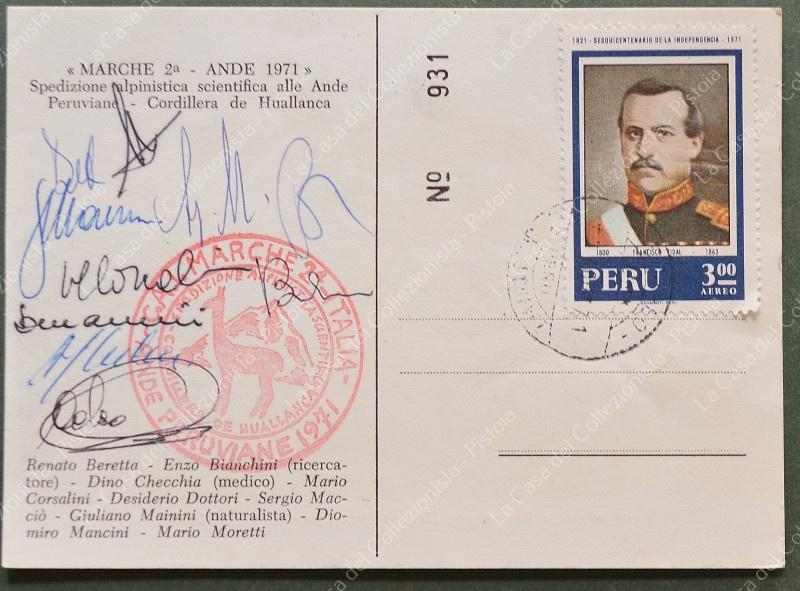 ALPINISMO - AUTOGRAFI - PERU'. 1971. Spedizione alpinistica scientifica alle Ande Peruviano. Cartolina numerata con le firme dei partecipanti. (Rif.F6596)