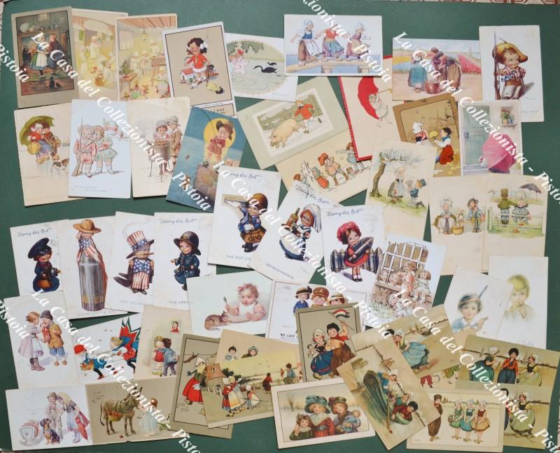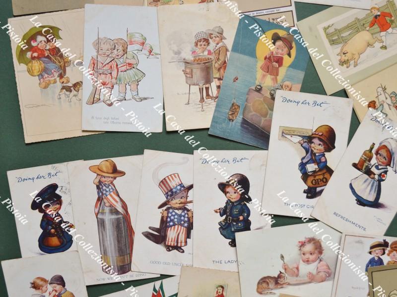 BAMBINI. 47 cartoline a colori di piccolo formato (cm 14x9) spedite ad unico destinatario tra il 1914 ed il 1930. Realizzate da noti illustraori; non vi sono cartoline fotografiche. Conservazione in genere buona eccetto lievi inevitabili difetti. (Rif.F7418)