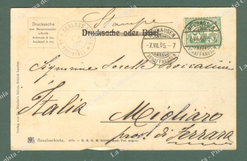 CARTOLINA ANIMATA. Cascata del Reno. Una rotella alla base fa apparire nel cerchio, 5 differenti vedute. Cartolina d'epoca viaggiata nel 1905. Ottima conservazione. (Rif.E0833)
