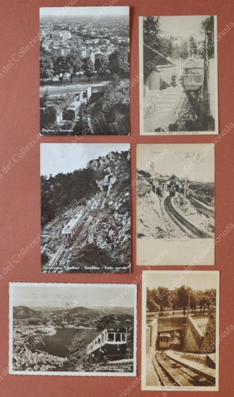 FUNICOLARI. 6 cartoline d'epoca (3 formato grande). Quattro sono viaggiate tra il 1904 e il 1952: Genova (2 diverse), Montevergine, Bergamo (2 diverse), Brunate. (Rif.F6572)