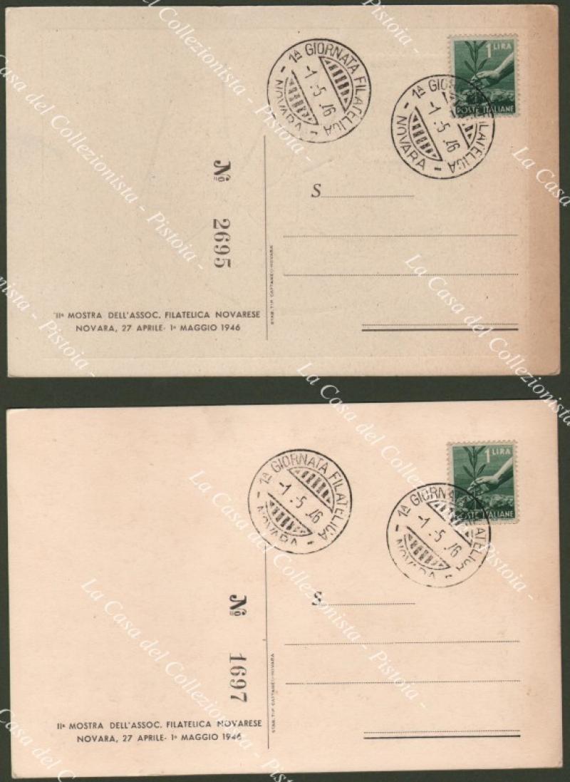 NOVARA MOSTRA FILATELICA 1946. 2 cartoline con annullo speciale, ottima conservazione. (Rif.D7154)