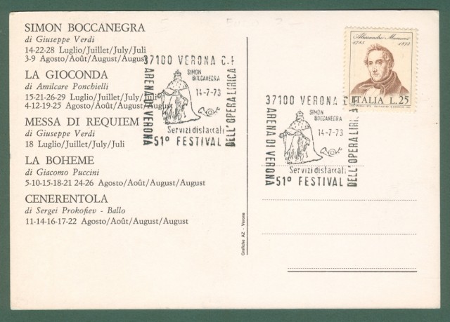 LIRICA. ARENA DI VERONA stagione 1973. Cartolina d'epoca con bollo speciale