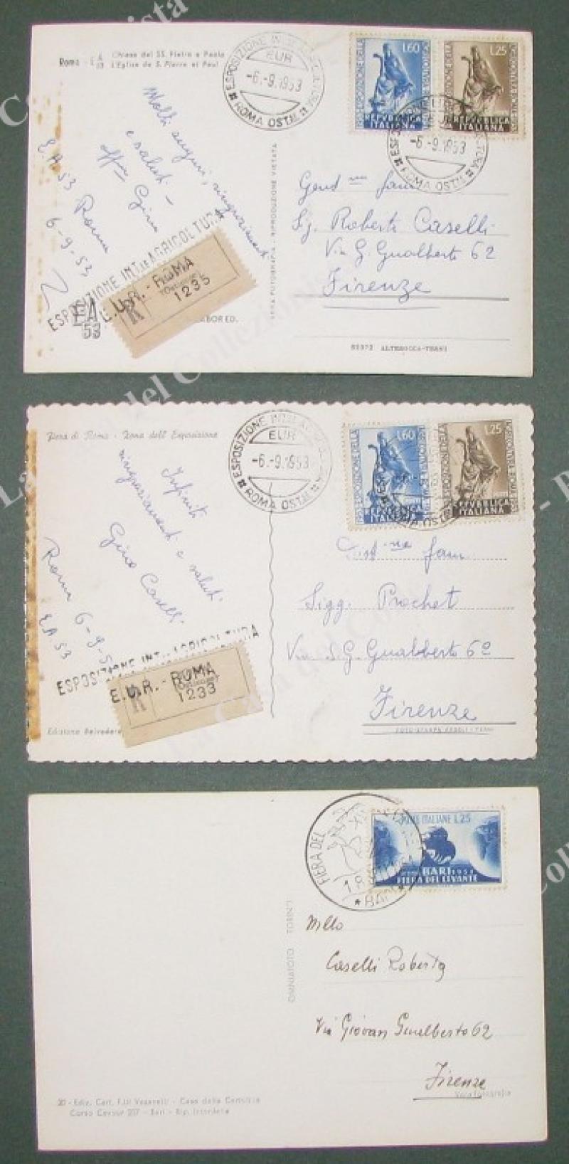 3 CARTOLINE (Fiera del Levante di Bari del 1951 e Esposizione Agricoltura Roma 1953) per Firenze. (Rif.E3353)