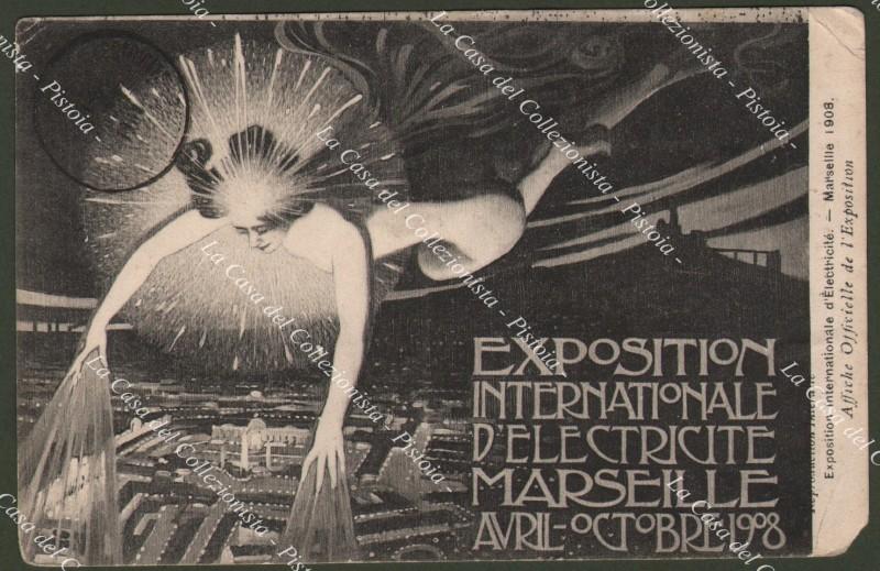Esposizione internazionale d'elettricità Marsiglia 1908. Cartolina d'epoca viaggiata, un angolo smussato, francobollo asportato. (Rif.D7126)