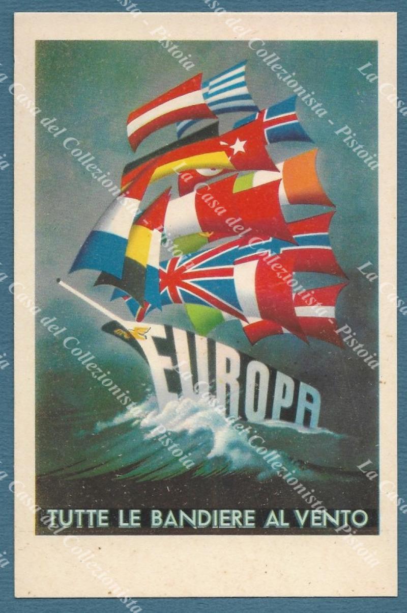 EUROPA. TUTTE LE BANDIERE AL VENTO. Cartolina dis. a colori, circa 1949