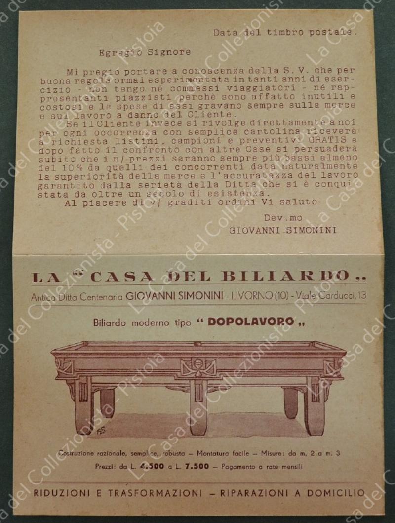 FABBRICA BILIARDI SIMONINI di LIVORNO. Cartolina doppia, anni 1920.