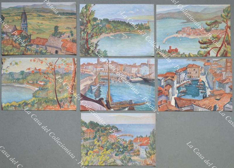 ITALIA SOCIETA' DI NAVIGAZIONE. 7 cartoline disegnate da Fantoni con vedute di Miramare, S. Daniele del Carso, Capodistria, Sistiana, Isola d'Istria, Mugga, Grignano. Non viaggiate, circa 1950. Ottima conservazione. (Rif.D7283)
