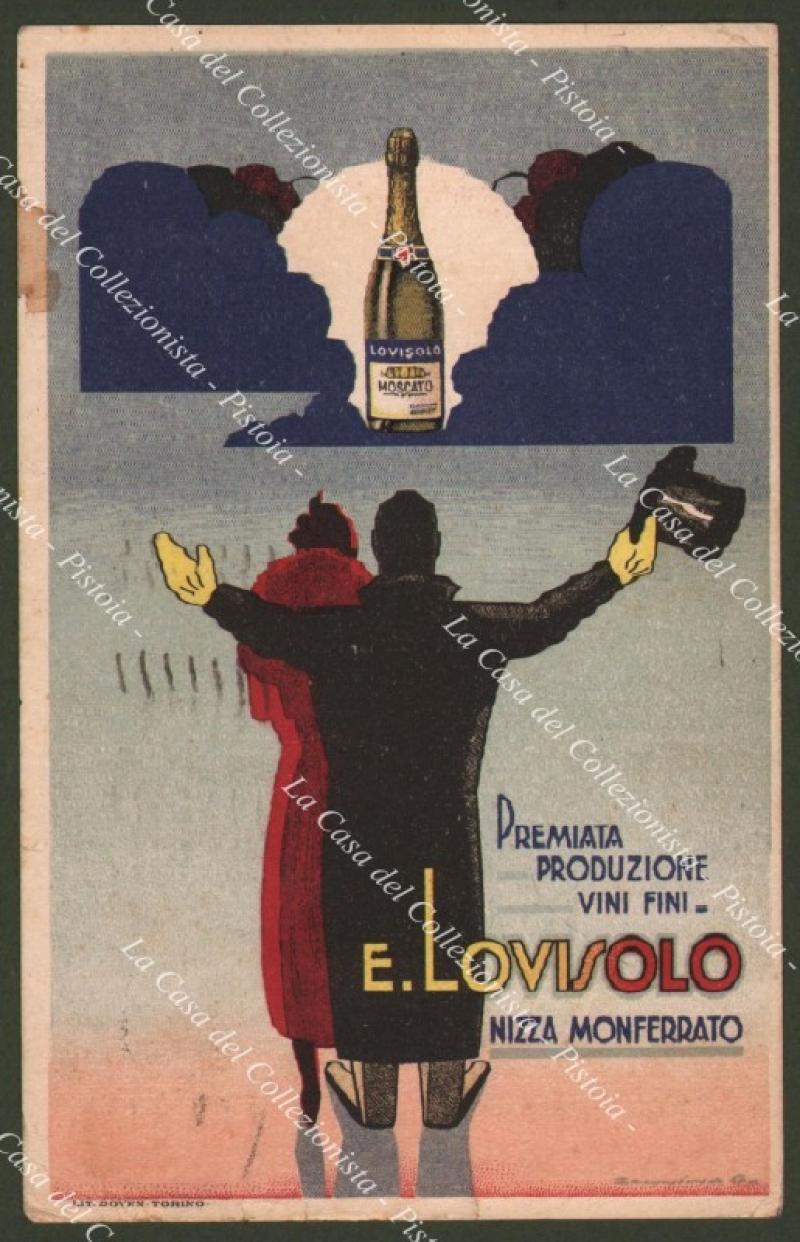 Nizza Monferrato. PREMIATA PRODUZIONE VINI FINI E. LOVISOLO. Cartolina viaggiata nel 1938, Lit. Doyen di Torino. Una macchietta bruna laterale due angoli con pieghetta. (Rif.D8989)