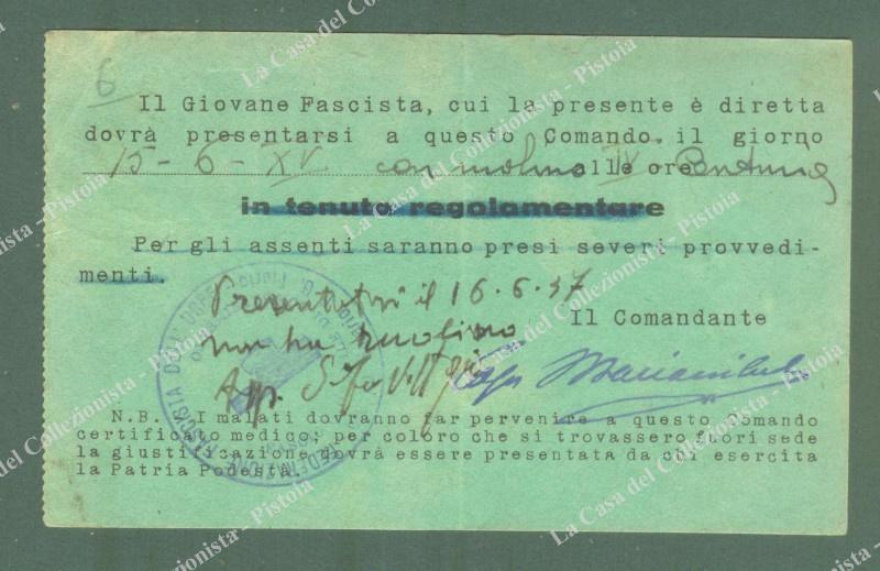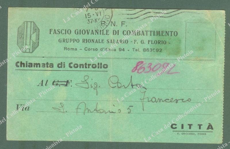 P.N.P. FASCIO GIOVANILE DI COMBATTIMENTO GRUPPO RIONALE SALARIO F.G. FLORIO di Roma. Cartolina d'epoca di chiamata del 1937