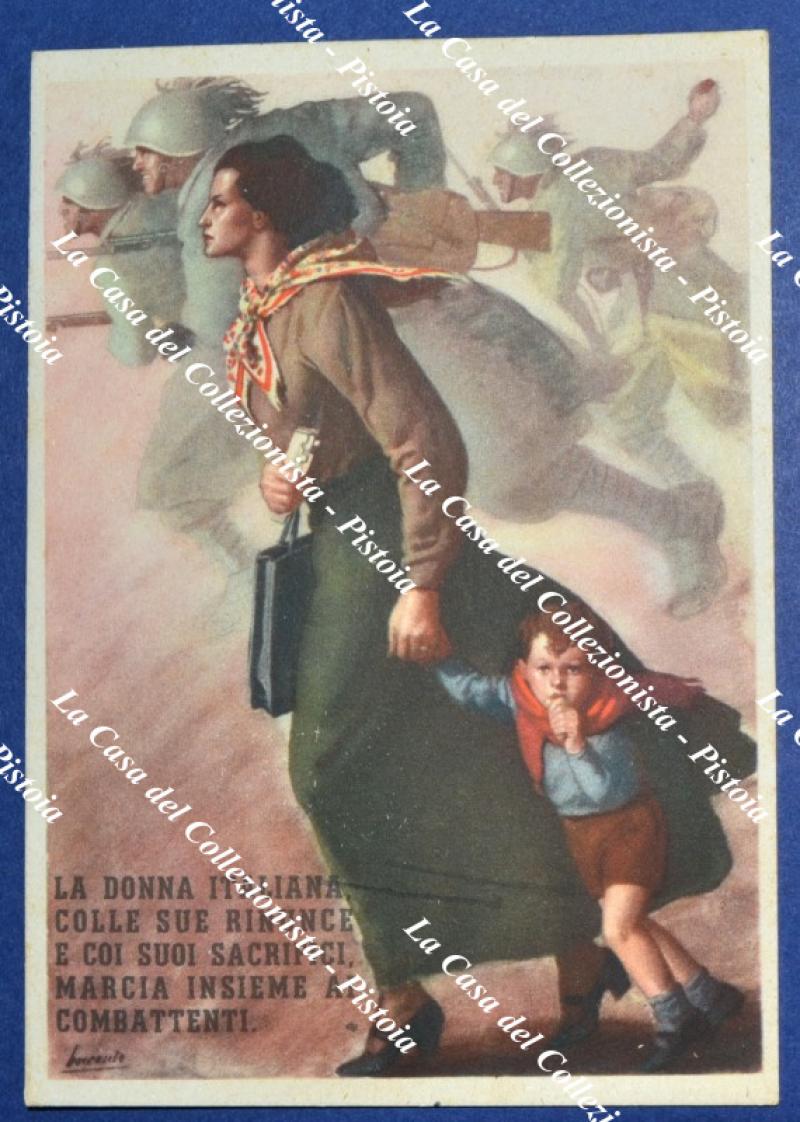 BOCCASILE. LA DONNA ITALIANA COLLE SUE RINUNCE E COI SUOI SCARIFICI MARCIA INSIEME AI COMBATTENTI. Cartolina d'epoca formato grande, circa 1940. (Rif.F5586)