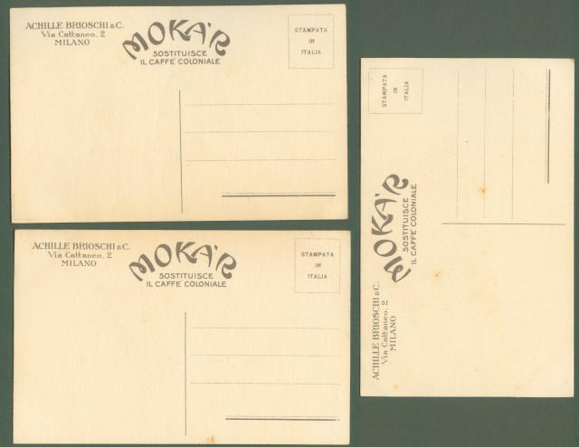 MAZZA ALDO. MOKAR caffè coloniale. Tre cartoline pubblicitarie disegnate a colori. Non viaggiate, circa 1925. Ottima conservazione eccetto minimi punti di ingiallimento a retro. (Rif.C2700)