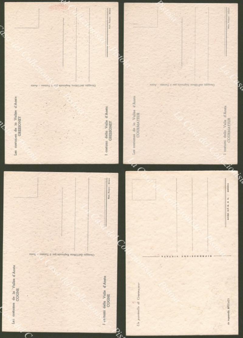 MUSATI. 4 cartoline con costumi della Val d'Aosta: Courmayeur (2), Cogne, Gressoney. Non viaggiate, circa 1952, perfette. (Rif.D7357)