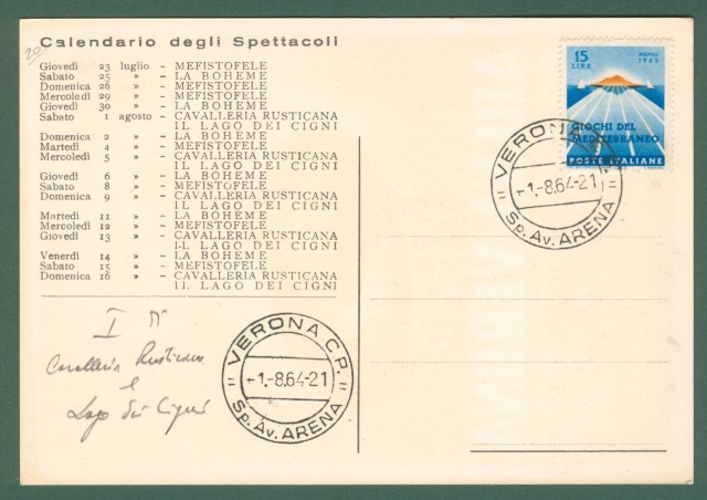 RUZZENENTE. Cartolina d'epoca pubblicitaria ARENA VERONA stagione lirica 1964. Bollo speciale