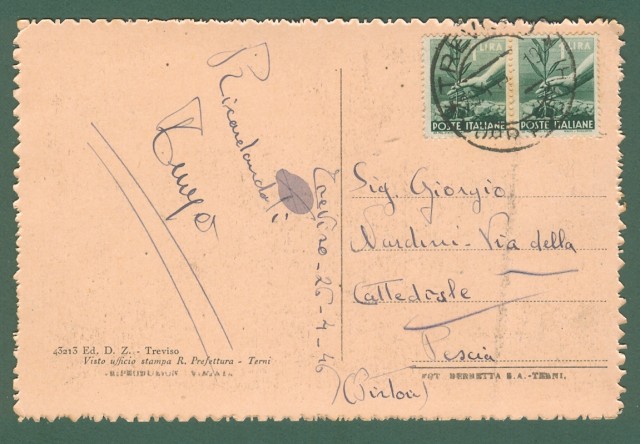 Veneto. TREVISO. Piazza dei Signori. Cartolina d'epoca viaggiata nel 1946. Buona conservazione. (Rif.C7535)