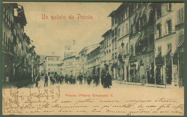 PESCIA. Piazza Vittorio Emanuele II. Bella animazione. Buona conservazione eccetto piega ad un angolo. Viaggiata nel 1902. (Rif.A9382)