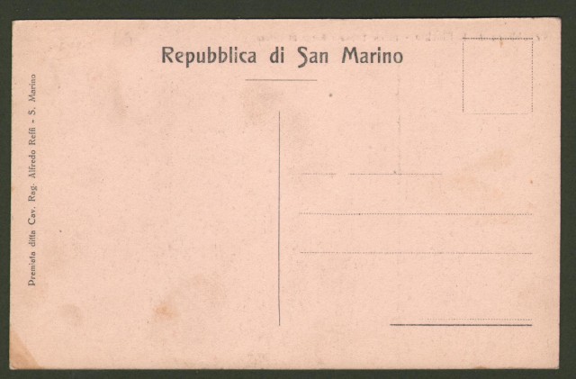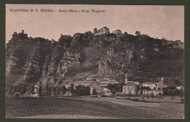 Repubblica di San Marino. Monte Titano e Borgo Maggiore. Panorama generale. Bella cartolina d'epoca non viaggiata, circa 1920. Formato piccolo (cm 14x9). Ottima conservazione. (Rif.A3280)