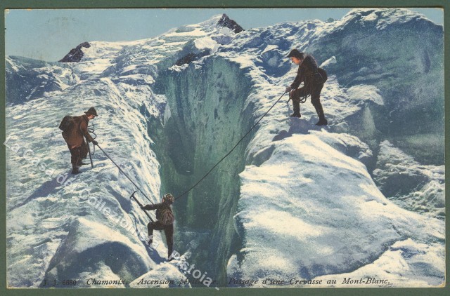 ALPINISMO.Chamonix. Passaggio di un crepaccio sul Monte Bianco. Cartolina d'epoca viaggiata nel 1919
