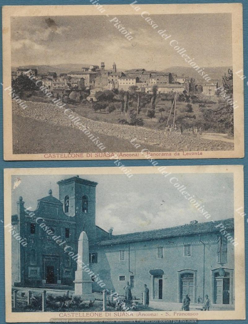 CASTELLEONE DI SUASA, Ancona. Due cartoline formato piccolo: 1) Panorama da levante, viaggiata nel 1927. 2) Chiesa San Francesco, non viaggiata, anni '30. Abrasione a retro e imperfezione al recto. (Rif.F5175)
