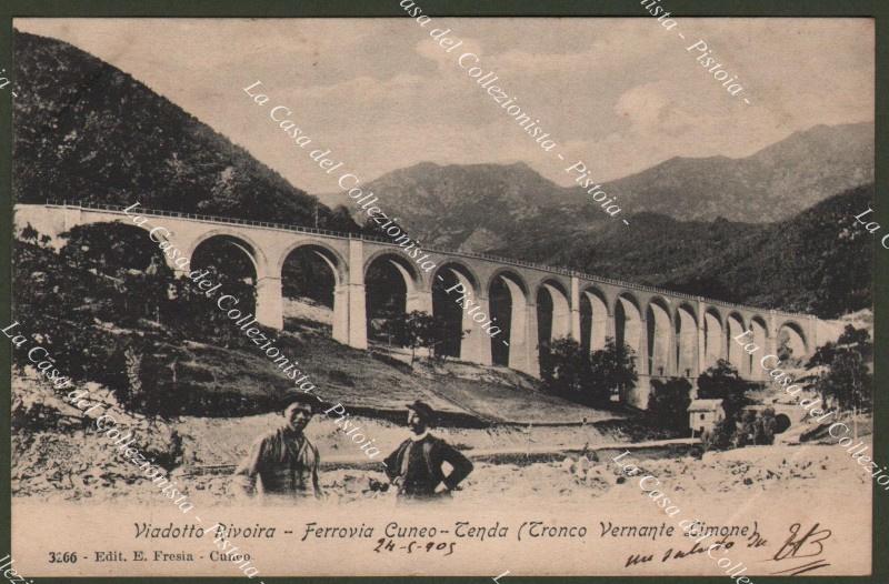 Cuneo, ferrovia. VIADOTTO RIVOIRA. ferrovia Cuneo-Tenda. Cartolina d'epoca viaggiata nel 1905. (Rif.D5660)