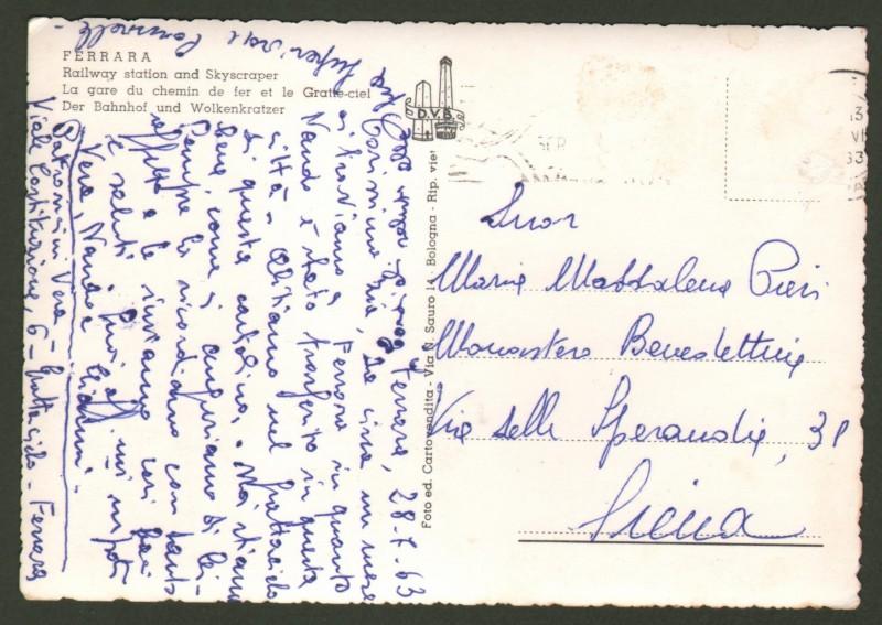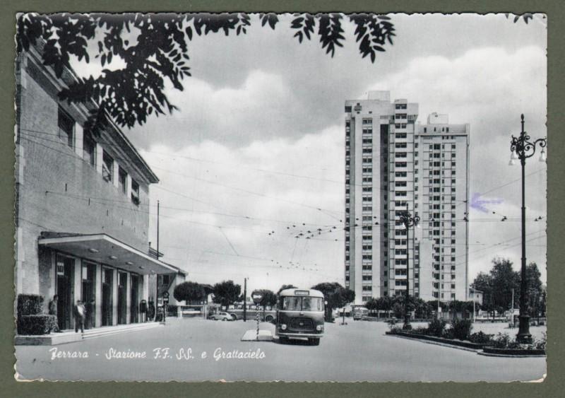 FERRARA, Stazione ferroviaria. Cartolina d'epoca formato grande, viaggiata nel 1963. Francobollo asportato. (Rif.F2007)