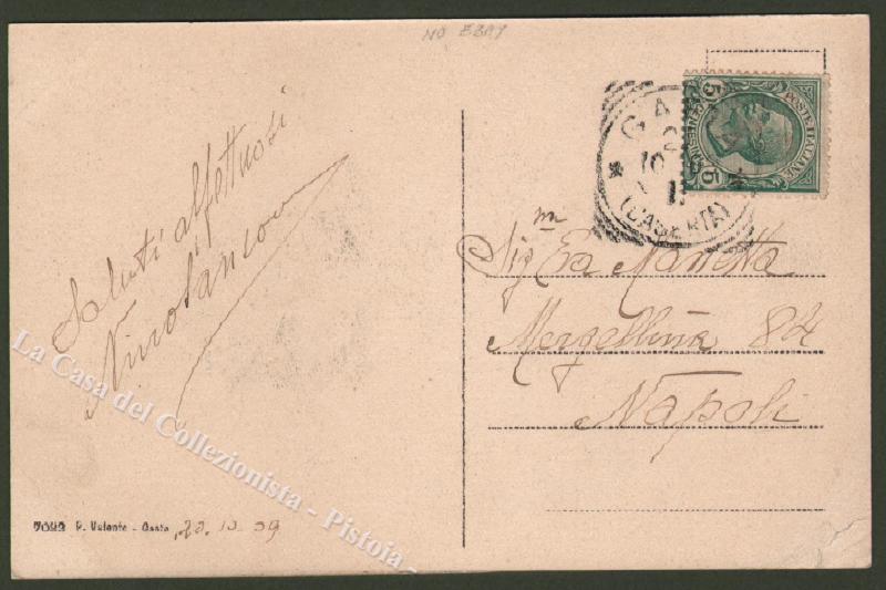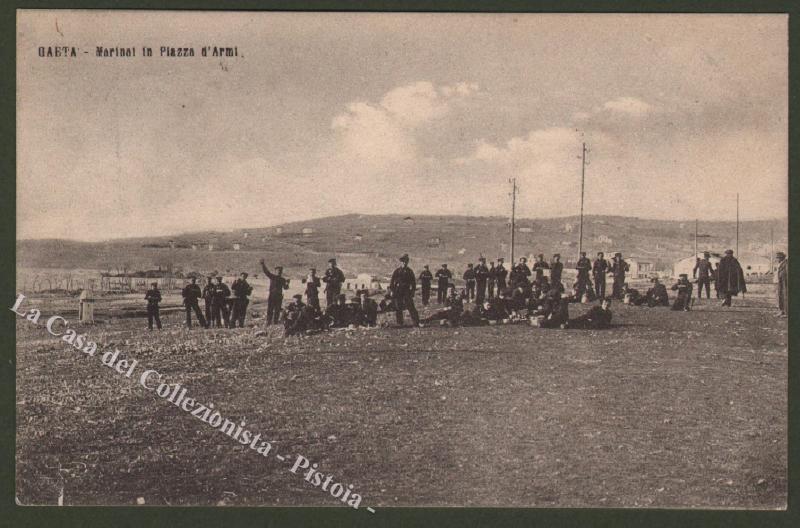 Gaeta. Marinai in Piazza d'Armi. Cartolina d'epoca viaggiata nel 1909. Un taglietto all'angolo inferiore sinistro. (Rif.D2056)