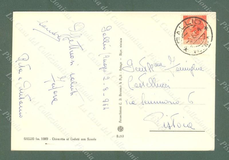 GALLIO, Vicenza. Chiesetta caduti e scuole. Cartolina d'epoca viaggiata nel 1954. (Rif.E4991)