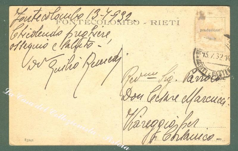 Lazio. FONTE COLOMBO, Rieti. Chiesetta della B.V. Maria. Cartolina d'epoca viaggiata nel 1932. Francobollo asportato. (Rif.D3941)