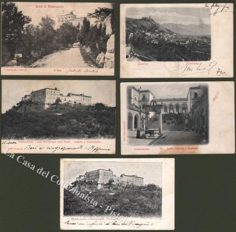 Lazio. MONTECASSINO, Frosinone. Cinque cartoline d'epoca tutte viaggiate nel 1902 - 1903. Piccoli segni di adesivo a retro. (Rif.D2353)